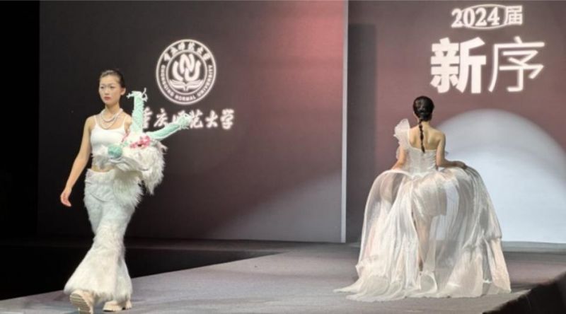 本次活動以“新序”為主題,100余件服裝畢業(yè)作品圍繞重慶市墊江區(qū)牡丹、角雕、竹編等文化元素展開。畢業(yè)生以服飾為媒介,融入地方文化元素進行設(shè)計,展示了重慶師范大學(xué)美術(shù)學(xué)院在學(xué)生教學(xué)方向、設(shè)計創(chuàng)新理念、藝術(shù)審美等培養(yǎng)方面的創(chuàng)新成果。